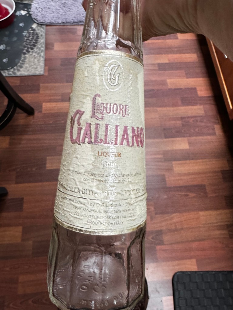 We had to track down the recipe, although we knew that it contained Galliano, Cream de Cacoa, and cream. Keep in mind this was before we had the internet in our homes. We must have tried to make it at least once, although I have no clear memory of the outcome. I found the tall bottle of Galliano when I was cleaning out and packing the booze cupboard.